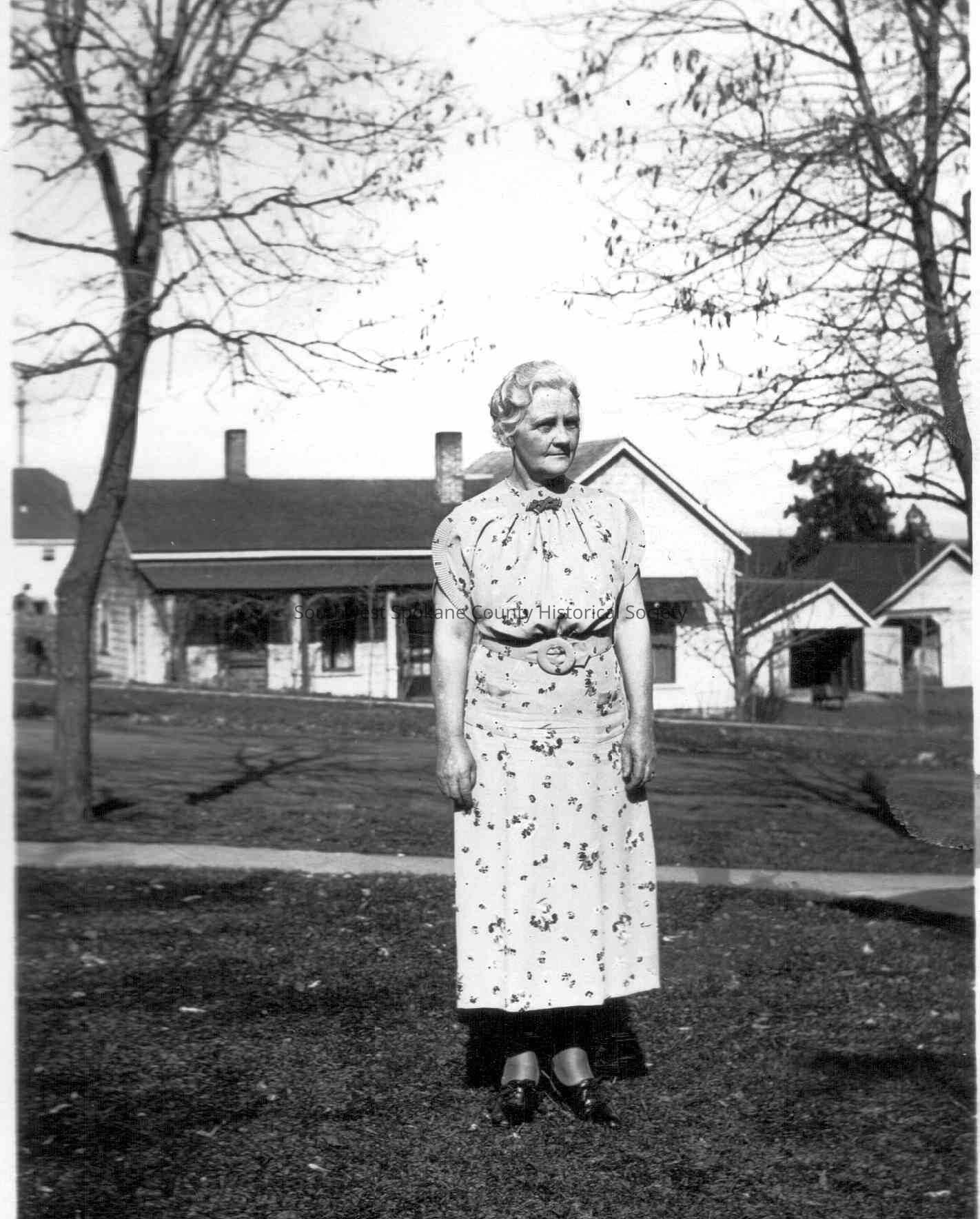Parents of May Harris Chambers: Unidentified woman in side yard of Grover & May Chambers' home at 220 B Street looking toward 217 B Street. This cannot be May's mother, Josephine Gleeson, as labeled unless it is another relative named Josephine Gleeson, but may be Flora Harris Linn. The photograph is undated but the size and style is from the 1920's of 1930's.Acquisition