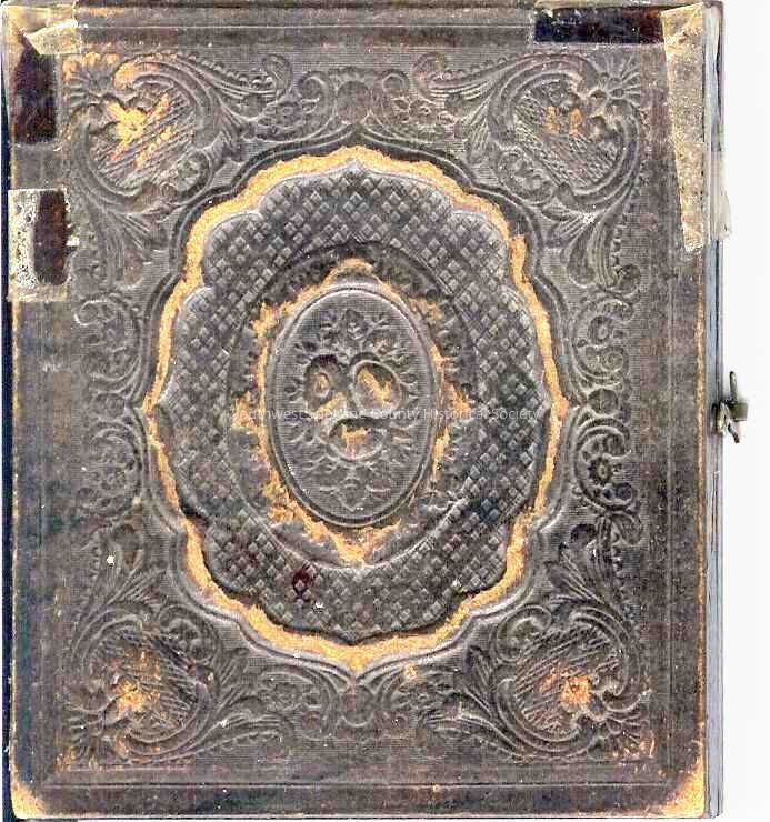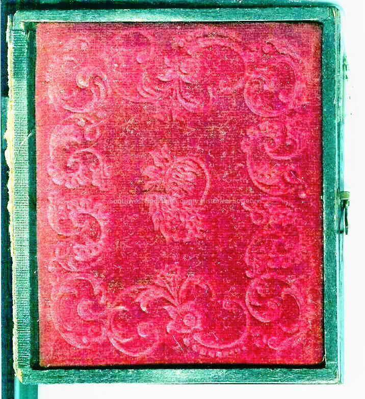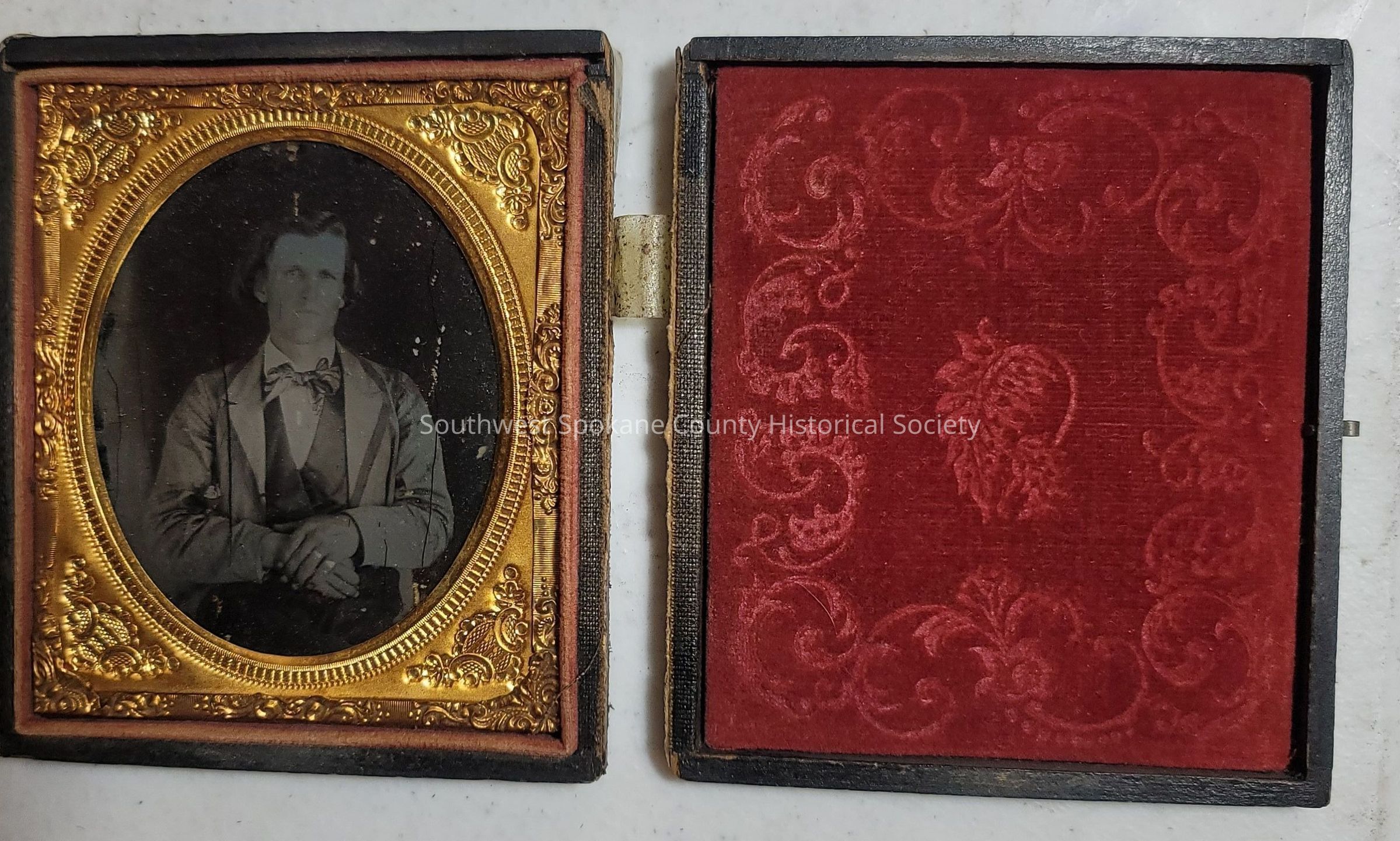 Small Ambrotype bust of a man. Gold metal mat with oval cutout in small wood book-like frame with red velvet on opposite leaf and latch closure. Carved front and back cover. Frame is 3.75" x 3.125" x .5"Collection