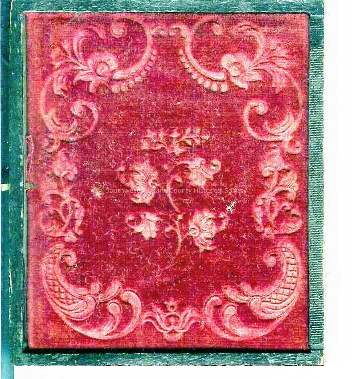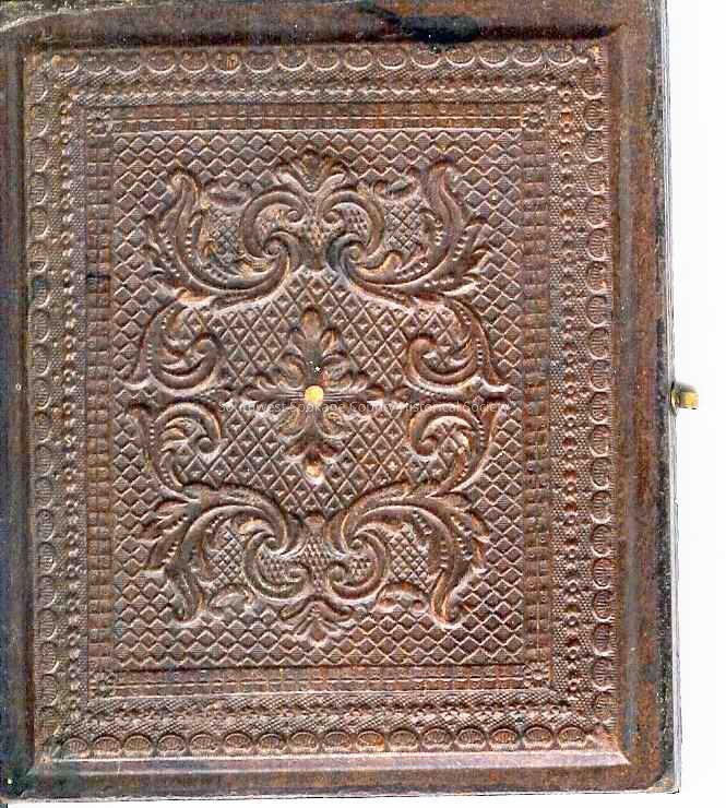 Small Ambrotype bust of a woman in mid-1800's dress. Gold metal mat with oval cutout in small wood book-like frame with red velvet on opposite leaf and latch closure. Carved front and back cover. Frame is 3.75" x 3.125" x .5"Collection