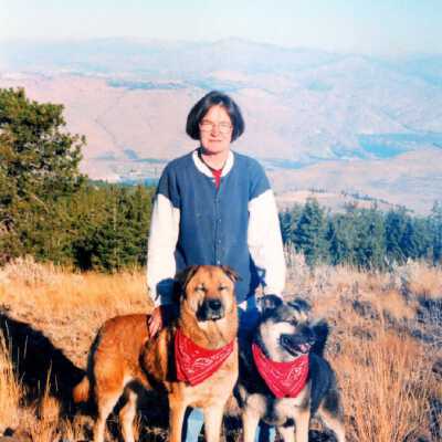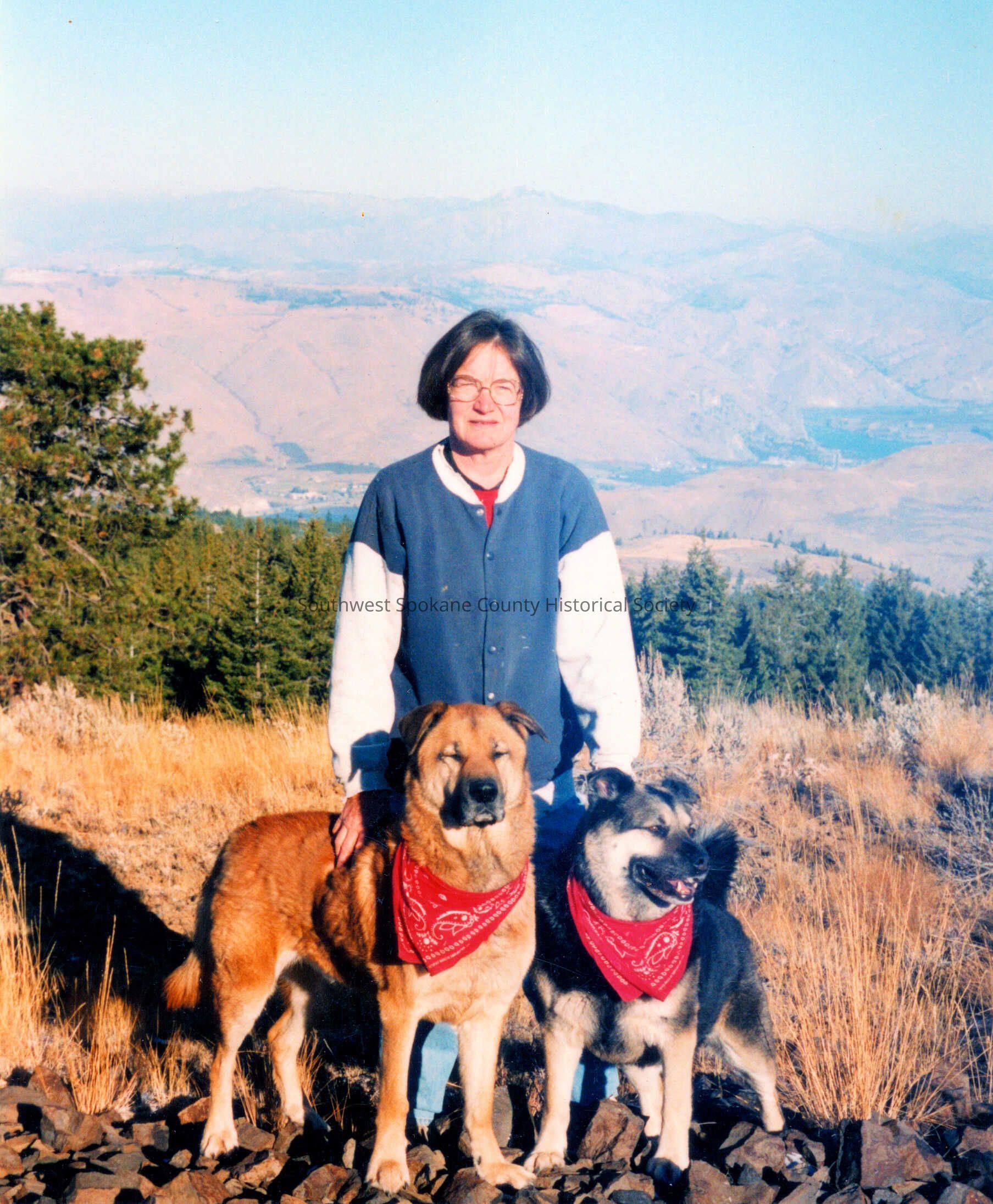 Color snapshot photo of Susie McKinley and her two dogs printed 31 October 2002.