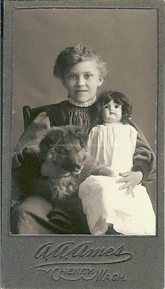 Scanned A.A. Ames Studio photo: (all measurements in inches) 2.6 x 1.65 photo mounted on 3.3 x 1.9 grey cardstock: undated portrait of unidentified youg girl holding dog and doll while sitting on chair.