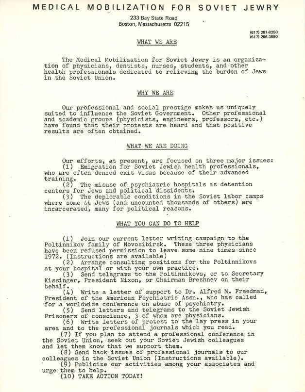 Fact sheet about the Medical Mobilization for Soviet Jewry.