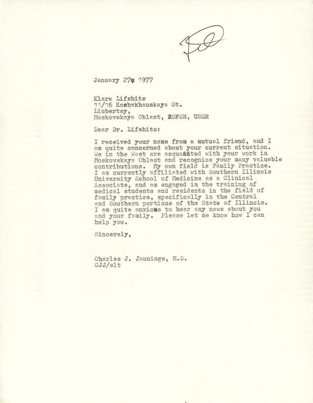 Letter expressing concern of Dr. Klara Lifshits's current situation in the Soviet Union.