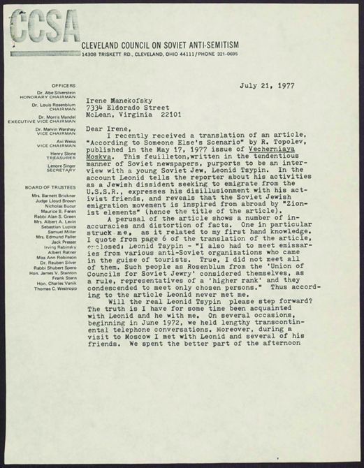 Cleveland Council on Soviet Anti-Semitism, Union of Councils for Soviet Jews, Rosenblum, Louis, Topolev, R., T︠S︡ypkin, Leonid, 1926-1982