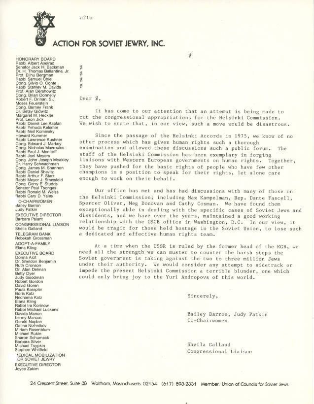 Letter objecting to cutting the congressional appropriations for the Helsinki Commission.