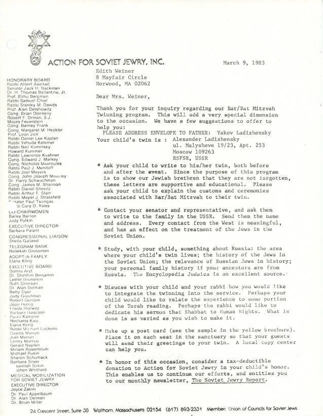 Letter with information on Weiner's Bar/Bat Mitzvah twin and what to do next.