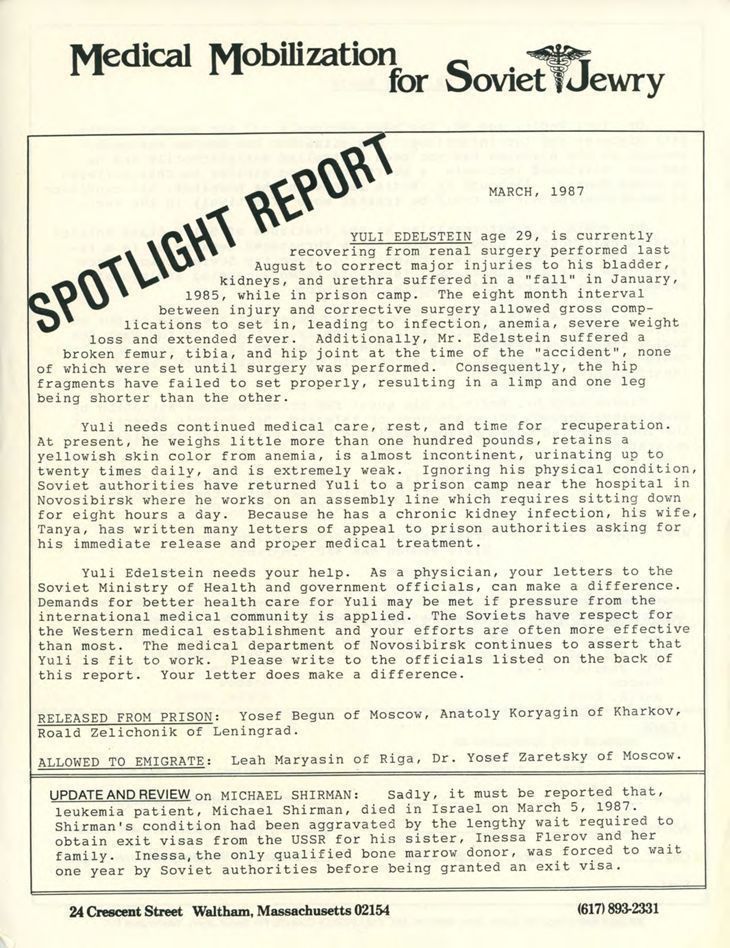Union of Councils for Soviet Jews, Edelshtein, Yuli, 1958-, Begun, Yosif, 1932-, Koryagin, Anatoly Ivanovich, 1938-, Zelichonik, Roald, Shirman, Michael, Rodin, I︠U︡riĭ Leonidovich, 1936-, Medical Mobilization for Soviet Jewry