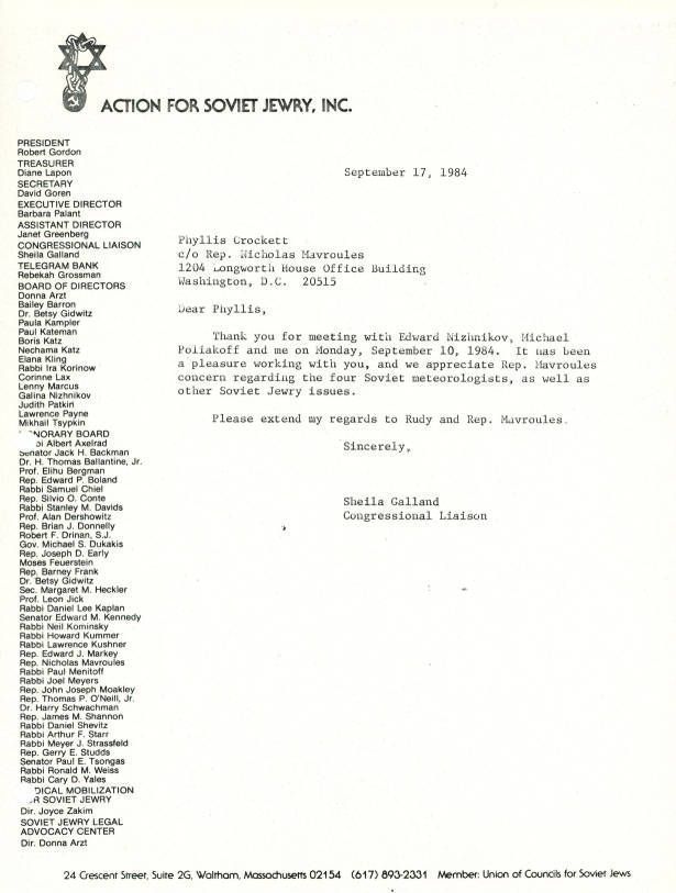 Union of Councils for Soviet Jews, Crockett, Phyllis, Nizhnikov, Edward, Pollakoff, Michael, Mavroules, Nicholas, 1929-2003
