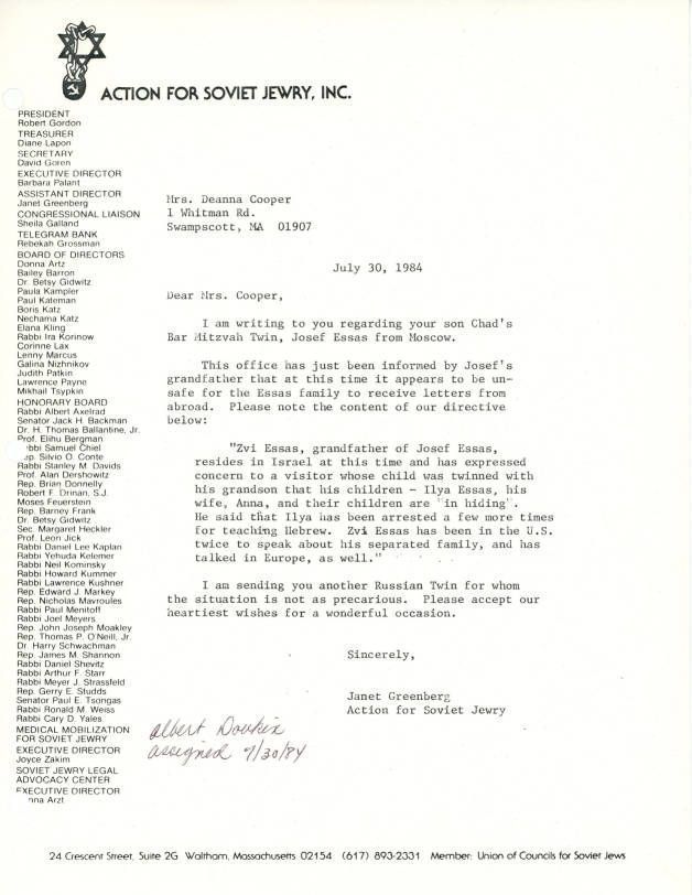 Letter informing the Cooper family that they should no longer to be sending letters to their current Bar Mitzvah Twin, and they would soon receive another child with whom they can correspond.Collection