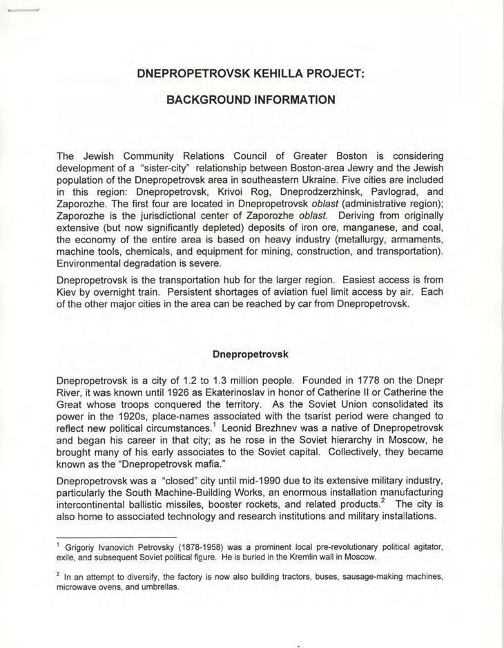 Information on the proposal to develop a "sister-city" relationship with cities in the Dnepropetrovsk area in southeastern Ukraine between Boston area Jews and the Jews of this Ukrainian region.