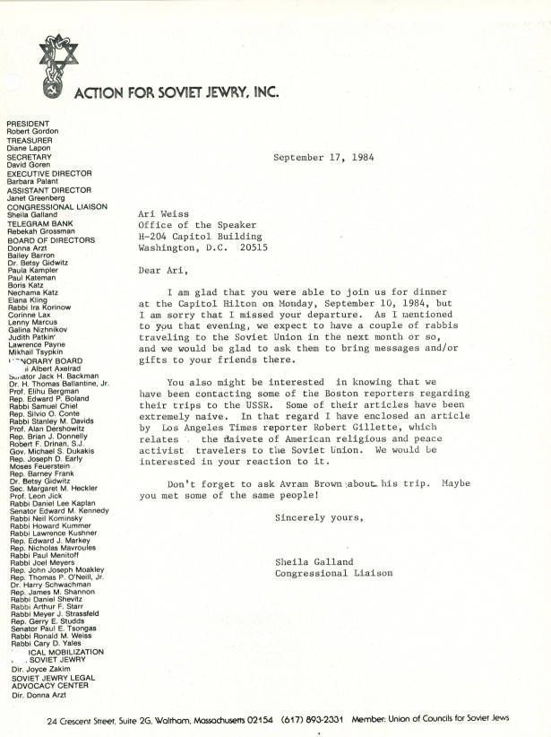 Letter thanking Weiss for a meeting and offering to put him in contact with rabbis traveling to the USSR.Collection