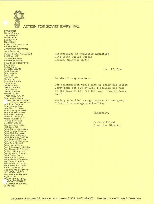 Letter ordering "On the Move--Soviet Jewry Game."Collection