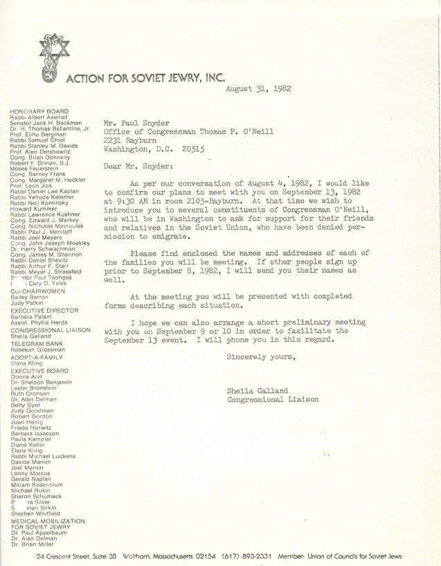 Letter confirming a meeting to have Snyder meet with families who have refusenik friends and family in the Soviet Union.