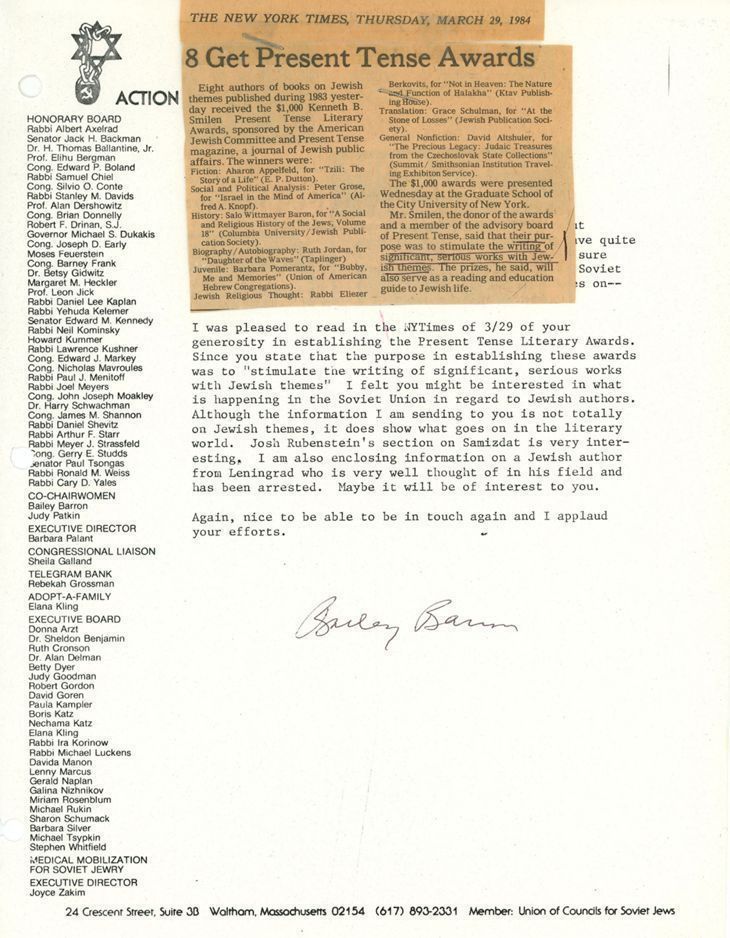 Letter commenting on Smilen's donation to establish the "Present Tense" awards and alerting him to what is happening with Jewish authors in the Soviet Union.