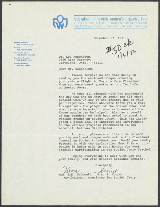 Cleveland Council on Soviet Anti-Semitism, Union of Councils for Soviet Jews, Rosenblum, Louis, Canadian Jewish Congress, Soviet Jewry Action Committee (Vancouver, B.C.), Federation of Jewish Women's Organizations (Toronto, ON), Federated Zionist Organization of Canada, Jewish Western Bulletin, United Herzlia Schools (Winnipeg, Man.), B'nai B'rith Hillel Foundation (University of Toronto), Action Committee for Soviet Jewry (Montréal, Québec), Zalmanson, Silva, Shapiro, Mark, Litt, Daniel, Cohen, Elle