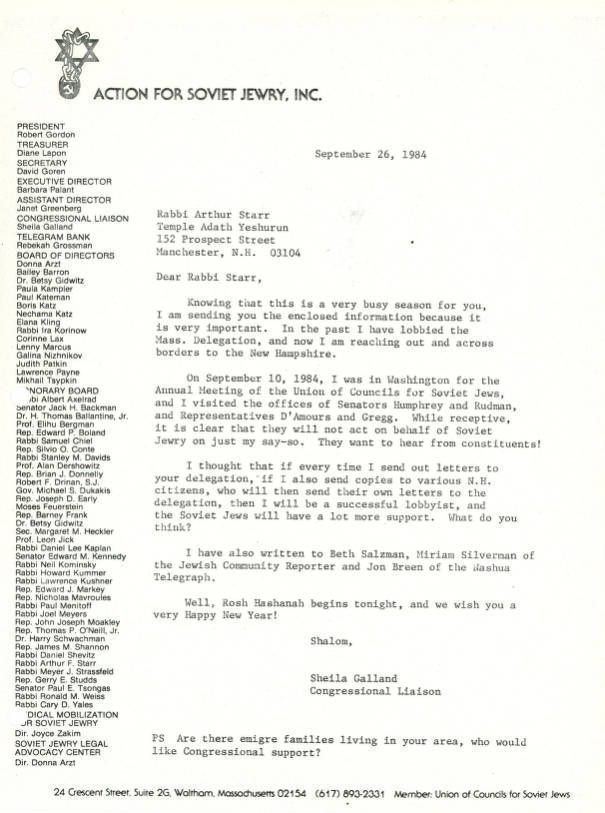 Letter encouraging Rabbi Starr to contact his congressmen about the plight of Soviet Jews.Collection