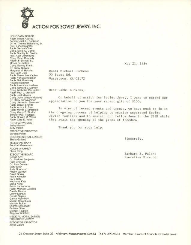 Jews -- Massachusetts -- Boston, Jews, Soviet, Refuseniks, Emigration & immigration, Donations, Rabbis