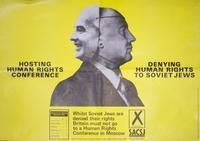 Poster depicting Soviet hypocrisy by hosting a human rights conference while denying basic freedoms to Soviet Jews, and calling on Britain not to attend. Includes a photo depicting a two-faced Gorbachev.