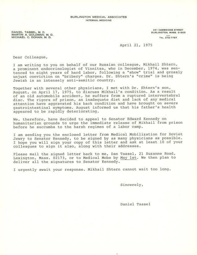 Letter requesting signatures on a letter to Senator Edward Kennedy to plea for help for Soviet doctor, Mikhail Shtern.
