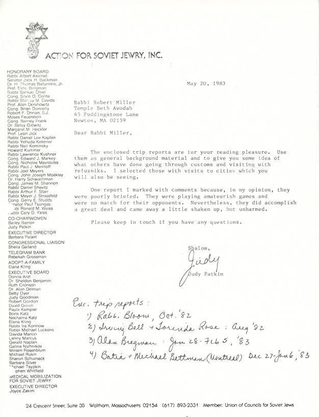 Correspondence - Judy Patkin to Rabbi Robert Miller