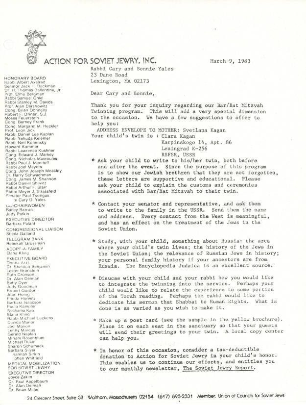Correspondence - Soviet Jewry to rabbi Cary and Bonnie Yales