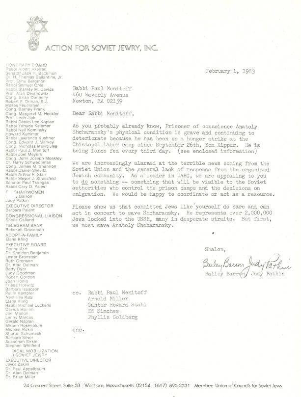 Letter imploring Menitoff to have the Union of American Hebrew Congregations to do something to help Anatoly Shcharansky and other Jews in the Soviet Union.