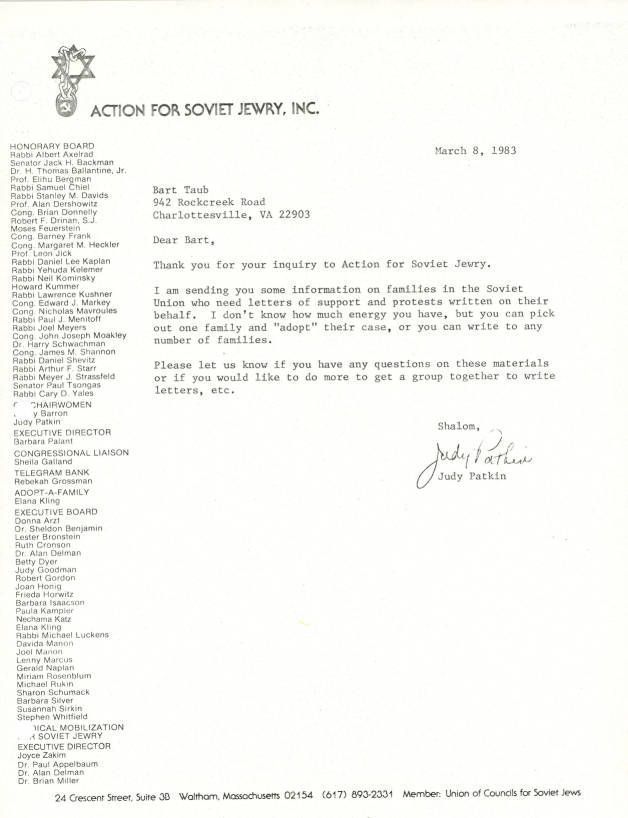 Correspondence - Judy Patkin to Bart TaubEntry/Object ID