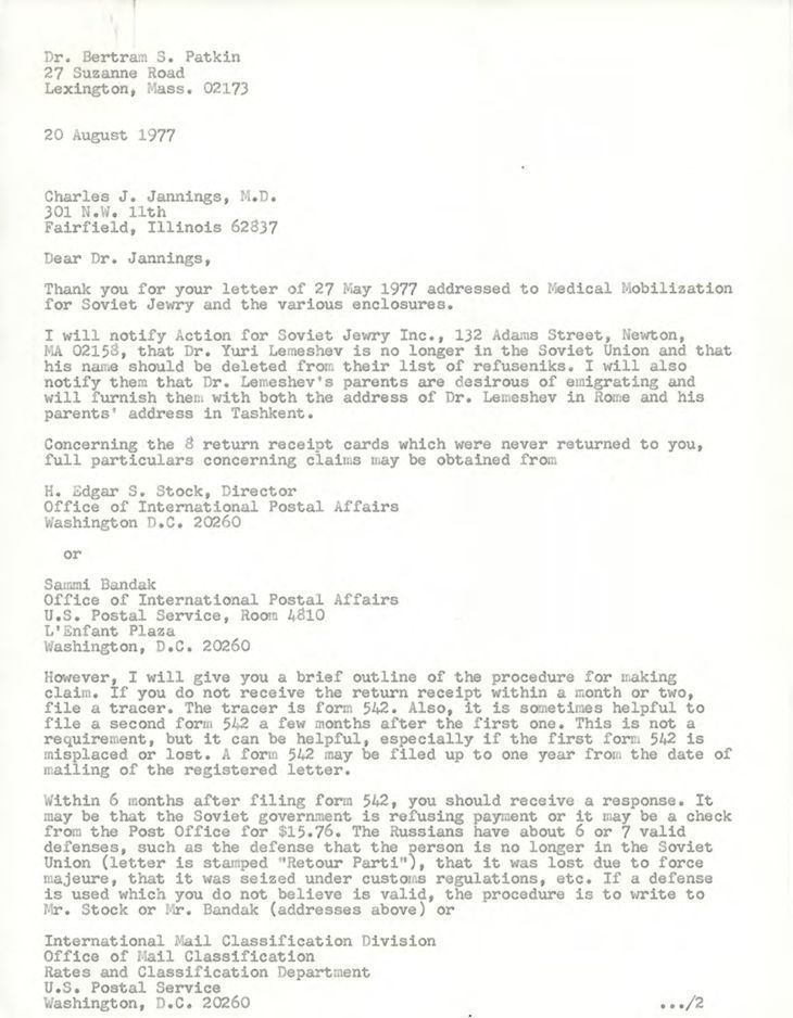 Union of Councils for Soviet Jews, Medical Mobilization for Soviet Jewry, Jennings, Charles J., Patkin, Bertram S., Moyseevna, Bela, Lemeshev, Leonid Yosifovich
