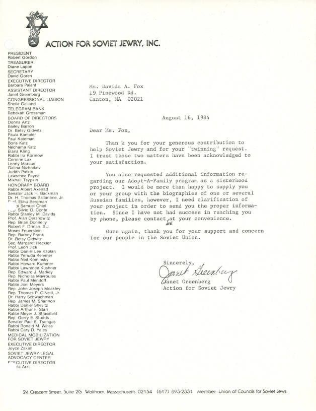 Correspondence - Janet Greenberg to Davida A. FoxEntry/Object ID