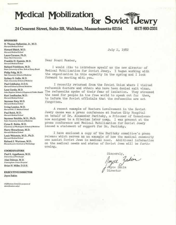 Letter from Zakim introducing herself as the new director of MMSJ. She also discusses her recent trip to the Soviet Union and the situation she saw.