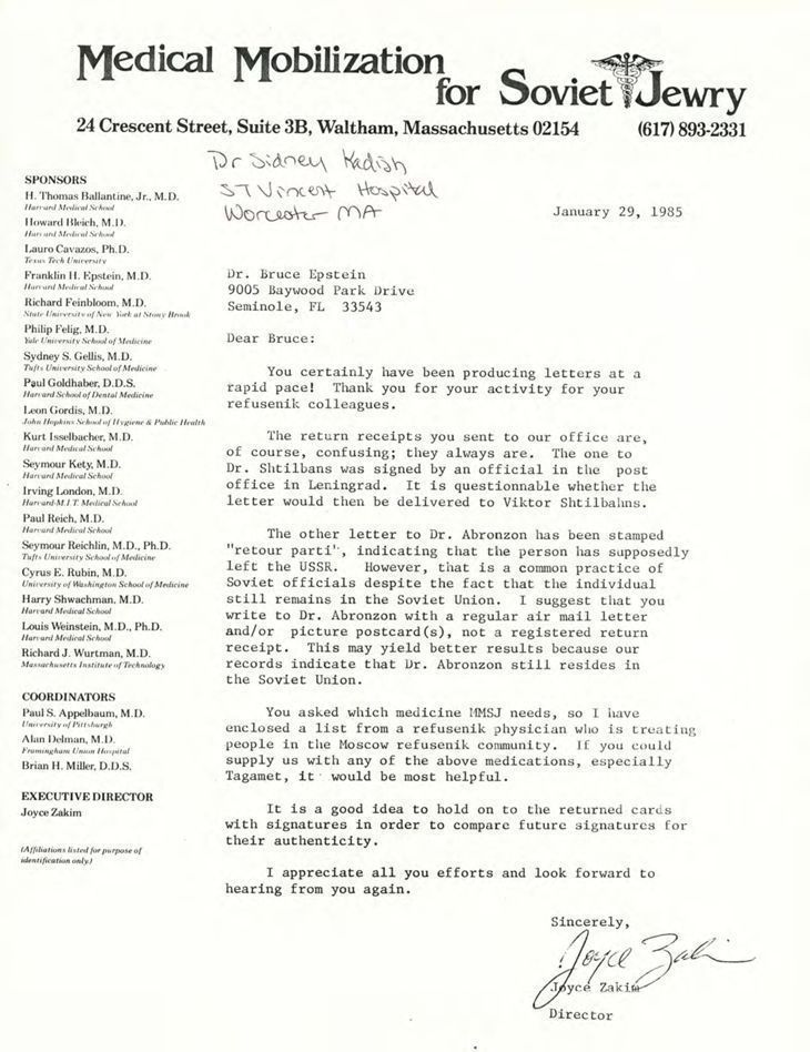Jews -- Massachusetts -- Boston, Refuseniks, Emigration & immigration, Jews, Soviet, Postal delivery, Medical care, Medicine, Human rights, Antisemitism