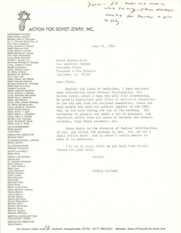 Jews -- Massachusetts -- Boston, Jews, Soviet, Emigration & immigration, Refuseniks, Physicians, Pharmacists, Donations