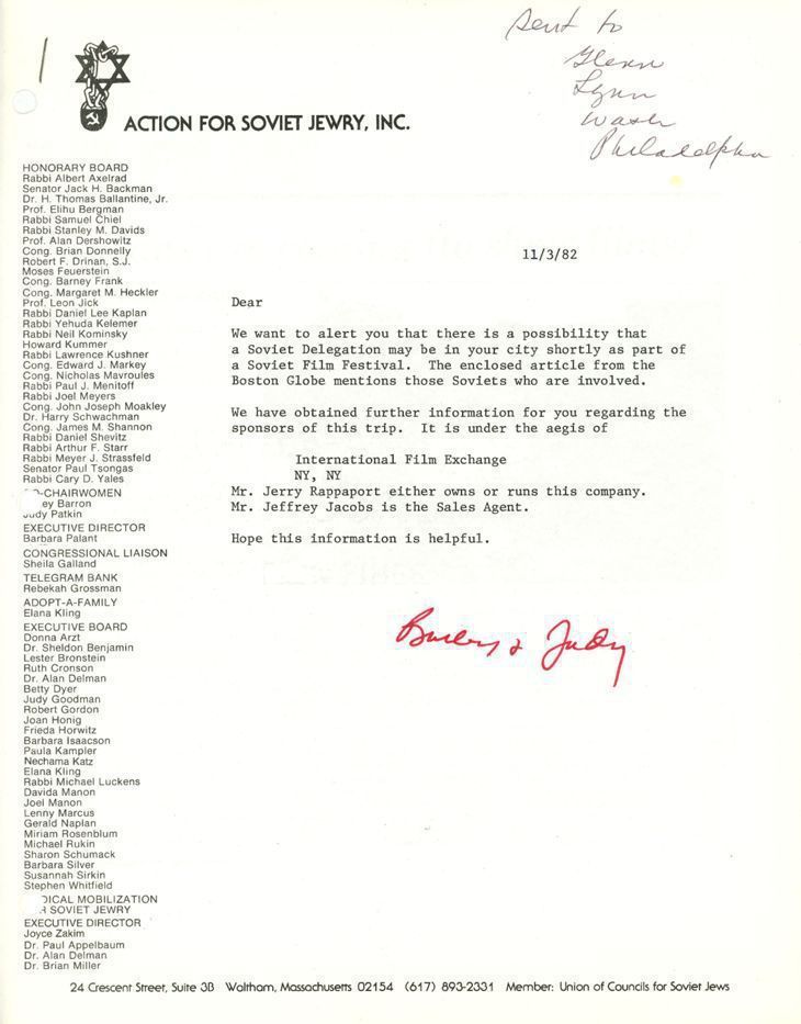Correspondence - Bailey Barron and Judy Patkin to Friends of Soviet Jewry