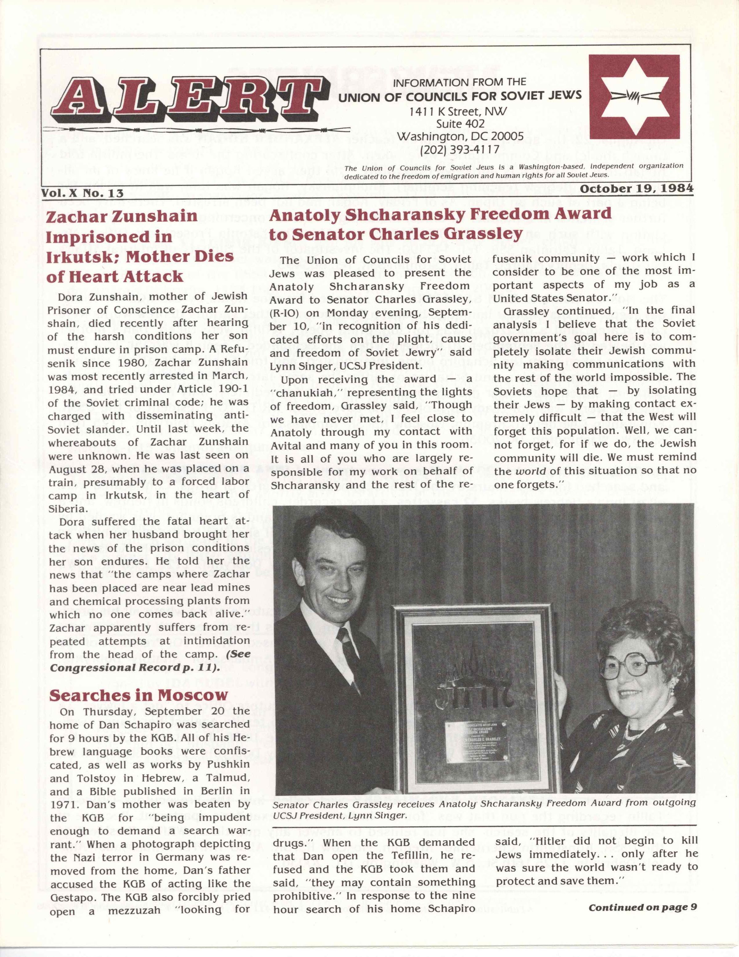 Zunshain, Dora, Jews, Soviet, Political prisoners, Grassley, Charles, Schapiro, Dan