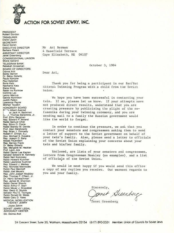 Letter following up on the Bar/Bat Mitzvah Twinning program and urging Berman to contact his congressmen.