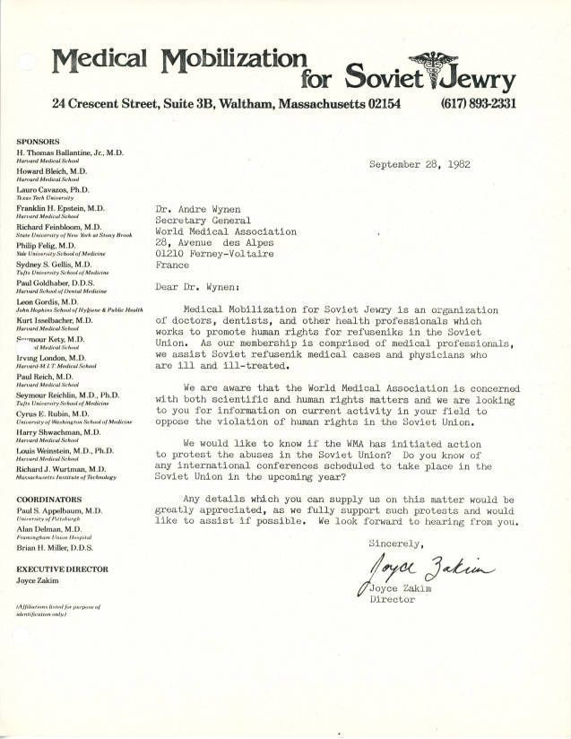 Letter asking Wynen what steps the World Medical Association has taken to protest the treatment of Soviet Jews.