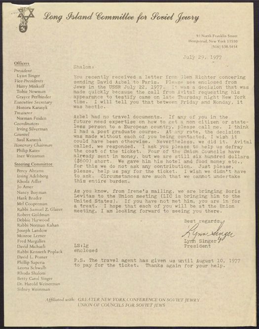 Cleveland Council on Soviet Anti-Semitism, Union of Councils for Soviet Jews, Rosenblum, Louis, Long Island Committee for Soviet Jewry, Singer, Lynn, -2005, Long Island Medical Committee for Soviet Jewry, Weissman, Inez Georgette Friedman, 1924-2014, Slepak, Vladimir, 1927-, Silverman, Irving, Shtern, Mikhail, 1918-, Perlbinder, Grayce