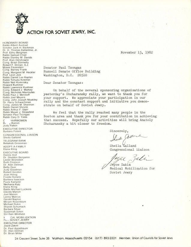 Union of Councils for Soviet Jews, Tsongas, Paul, Shcharansky, Anatoly