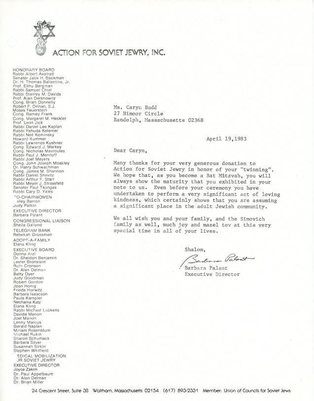 Jews -- Massachusetts -- Boston, Jews, Soviet, Emigration & immigration, Refuseniks, Bat Mitzvah, Donations