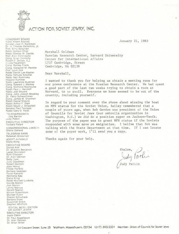 Letter thanking Goldman for the use of a room for a press conference and offering to send a paper on Russia's Most Favored Nation status.