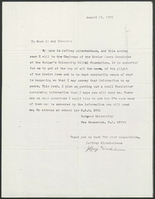Cleveland Council on Soviet Anti-Semitism, Union of Councils for Soviet Jews, Rosenblum, Louis, Zionist Organization of America, Temple Sharey Tefilo-Israel (South Orange, N.J.), Temple Beth Am (Bayonne, N.J.), B'nai B'rith Hillel Foundation (Rutgers University), Jewish Community Relations Council, Action Central for Soviet Jews, Tosk, Morris M., Seglin, Florence, Birnbaum, Moshe, Haas, Hedy, Beil, Michael