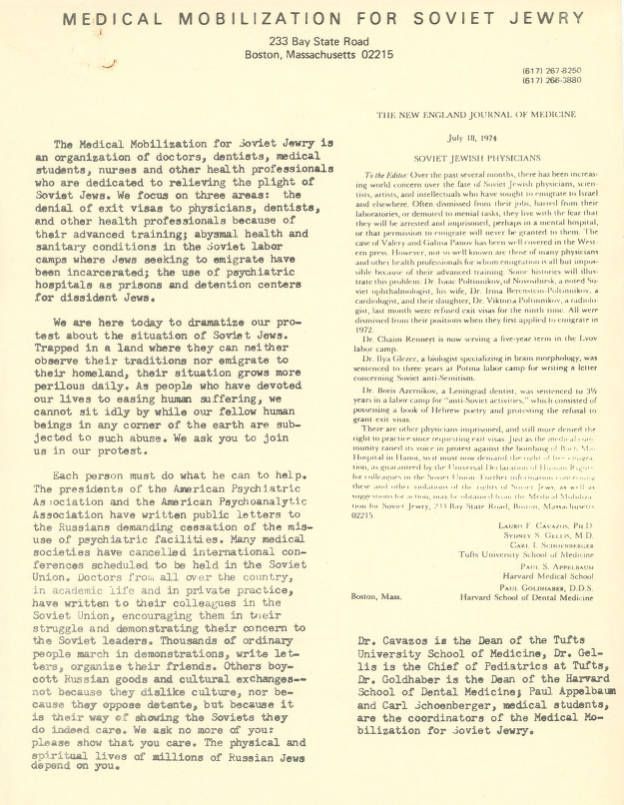 Mailing with information on Medical Mobilization and a request for support. Also includes a copy of a letter printed in The New England Journal of Medicine on Soviet Jewish Physicians.