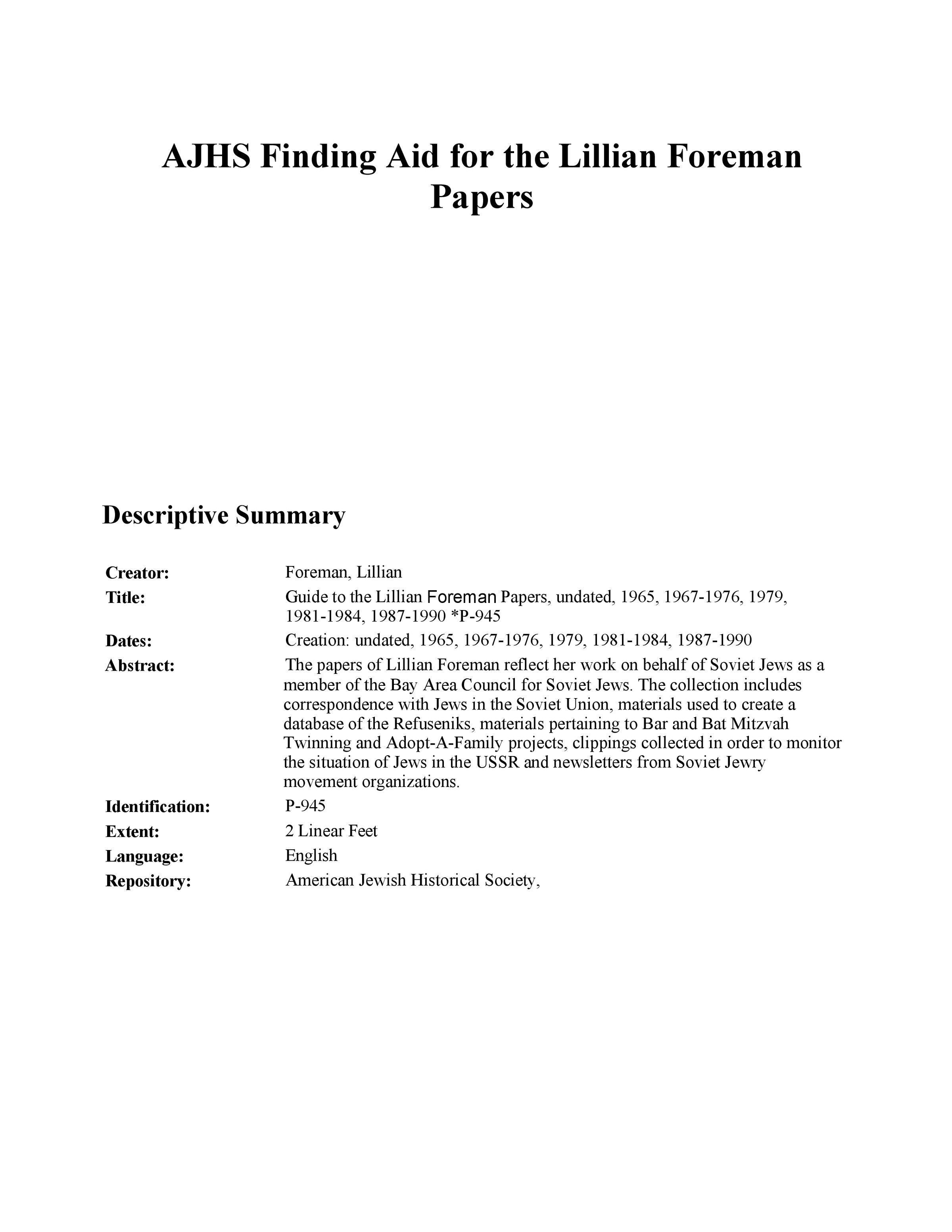 The papers of Lillian Foreman reflect her work on behalf of Soviet Jews as a member of the Bay Area Council for Soviet Jews. The collection includes correspondence with Jews in the Soviet Union, materials used to create a database of the Refuseniks, materials pertaining to Bar and Bat Mitzvah Twinning and Adopt-A-Family projects, clippings collected in order to monitor the situation of Jews in the USSR and newsletters from Soviet Jewry movement organizations.