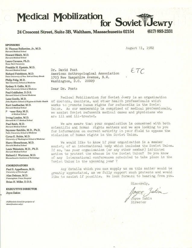 Letter asking if the American Anthropological Association has protested the abuses of Soviet Jews.