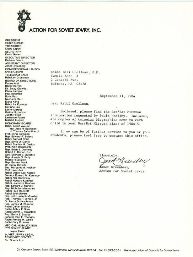 Letter enclosing requested Bar/Bat Mitzvah Twinning information.