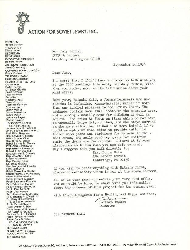 Letter thanking Balint for her offer to donate pants to mail to Russia and who to give them to.