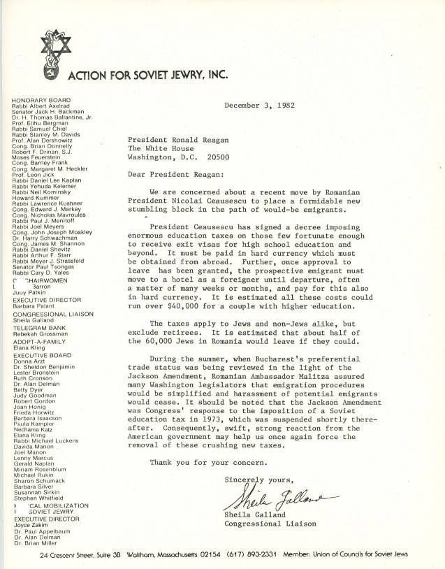 Jews -- Massachusetts -- Boston, Refuseniks, Emigration & immigration, Jews, Soviet, Political action, Human rights, Antisemitism, Jews--Romania, International trade, Taxes