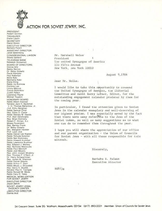 Letter expressing appreciation for a calendar produced by the United Synagogue of America and its attention to the plight of Soviet Jews.
