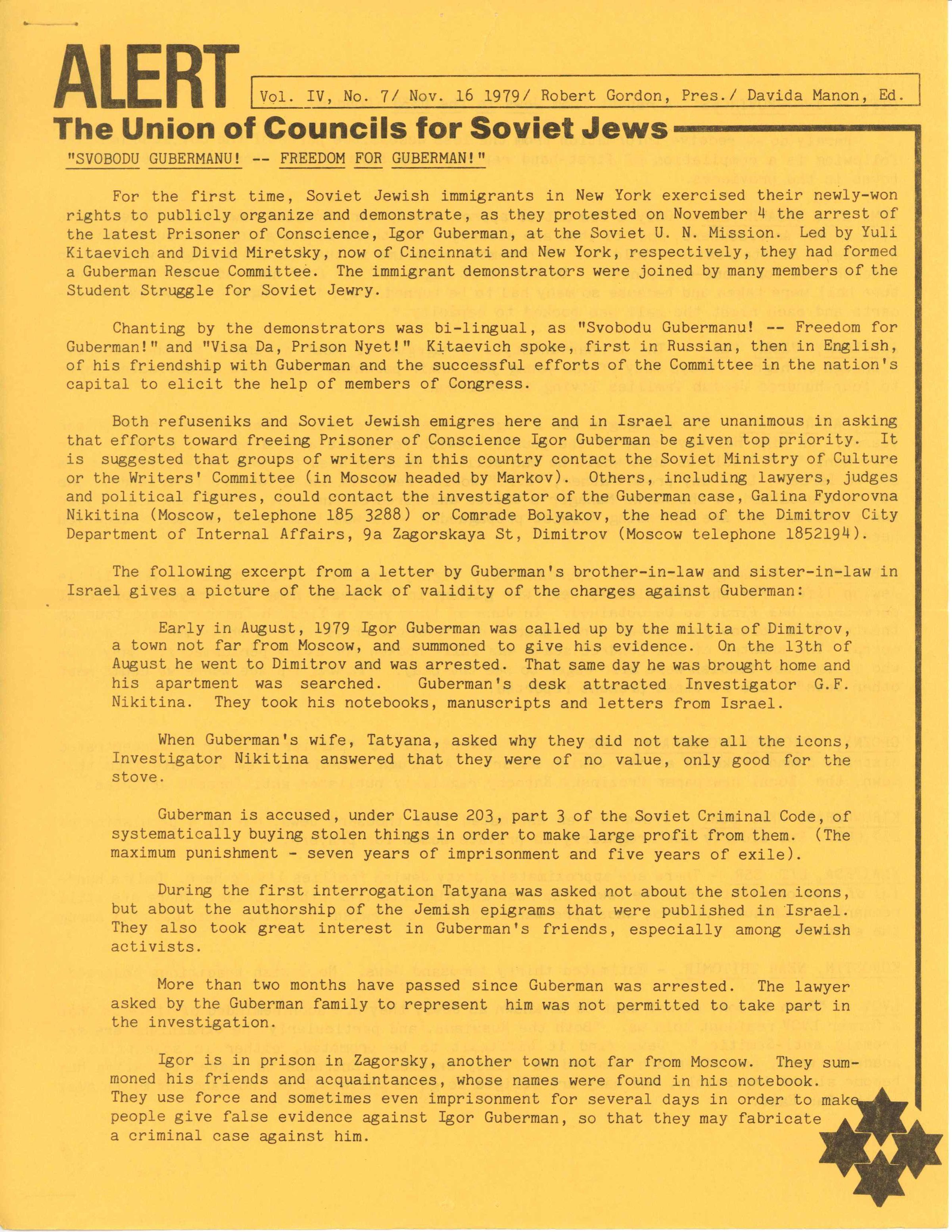 Immigrants, Jews--United States, Protests, Jews, Soviet, Political prisoners, Guberman, Igorʹ, Refuseniks, Slepak, Vladimir