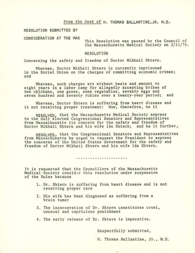Resolution concering the safety and freedom of doctor Mikhail Shtern